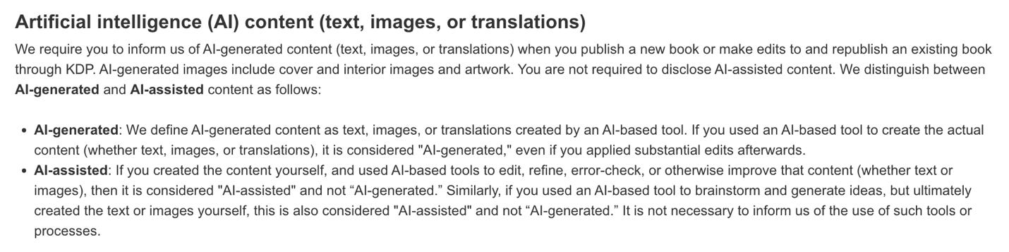 Clarkesworld Science fiction and fantasy Magazine prohibited AI generated content, while Amazon KDP implement guideline for the usage of AI in publishing kindle ebooks.